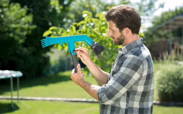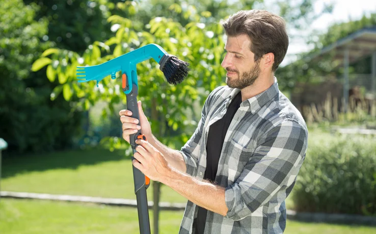 Pevně štětiny na jedné straně a dvě pevné plastové škrabky na straně druhé umožňují účinné čištění. K čištění rýn je také možné použít vodu díky integrované přípojce Original GARDENA System pro snadné napojení zahradní hadice.