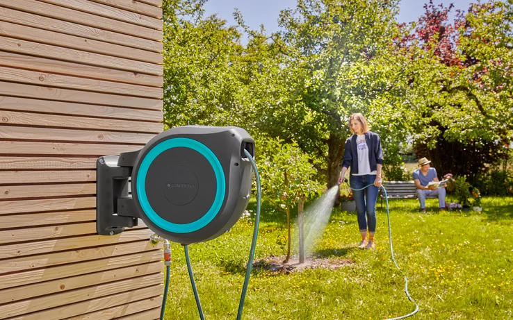 Pohodlné a praktické zavlažování velkých zahrad pomocí nástěnného boxu na hadici RollUp L.