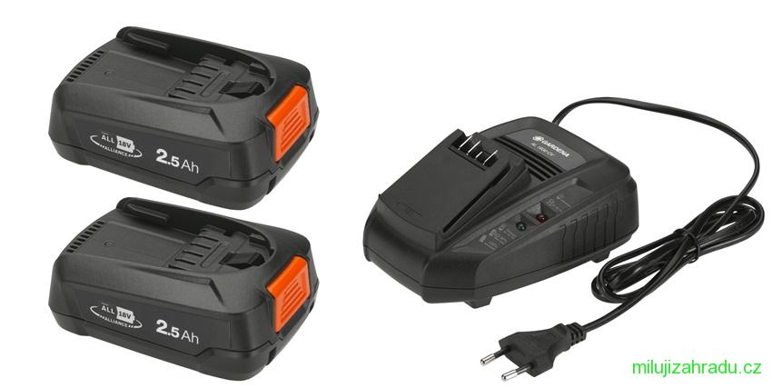 Tato startovací sada se skládá z rychlonabíječky GARDENA AL 1830 CV a dvou akumulátorů 2,5 Ah POWER FOR ALL.