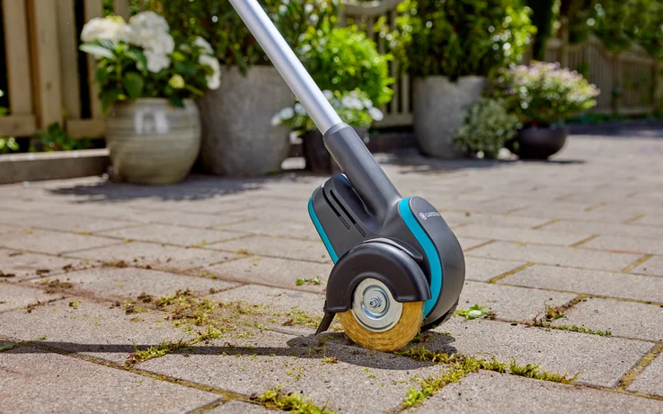 Weed Brush EasyWeed 1800/18V P4A GARDENA v sadě připravené k použití zjednodušuje a zefektivňuje odstraňování plevele díky efektivnímu designu a pohonu na baterie.