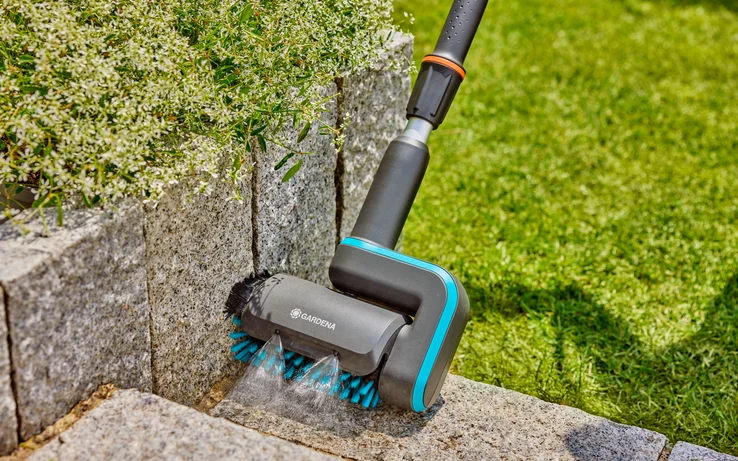 Akumulátorový multifunkční čistič GARDENA AquaBrush Universal v sadě připravené k použití pro snadné čištění smíšených povrchů, jako jsou garážová vrata a ploty.