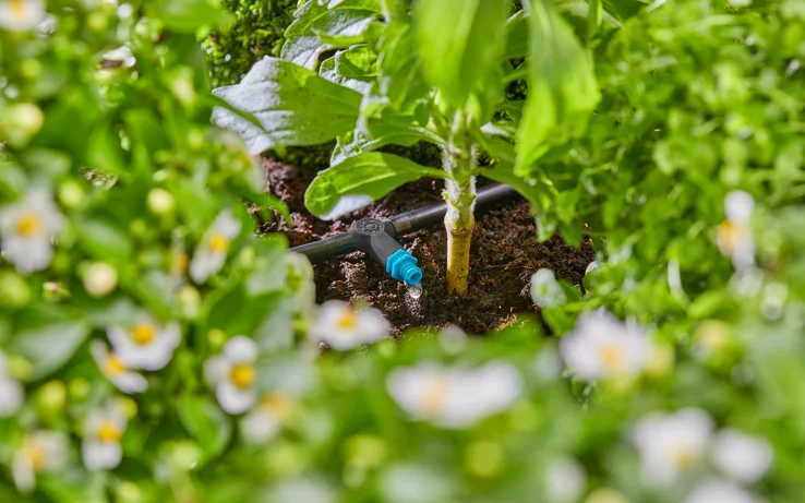 Deset zahrnutých řadových kapačů ve spojení s rozdělovací trubkou 4,6 mm spolehlivě zavlažuje výsadbu v řadcích, jako jsou balkónové truhlíky s podobnými požadavky na vodu.