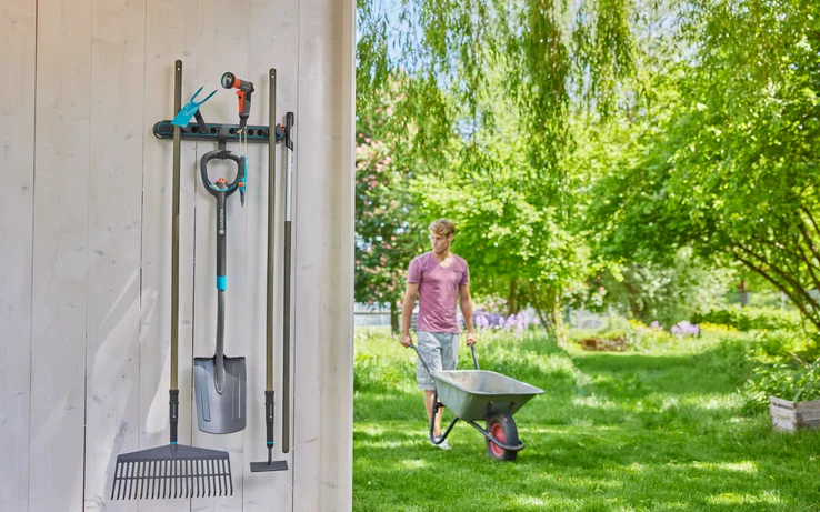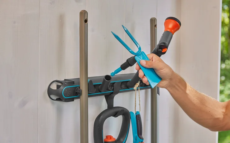 Věšák na nářadí disponuje dvěma držáky na násady, včetně možnosti uložení jednodílného zahradního nářadí při vodorovné instalaci. Navíc je zde úložný prostor pro dvě násady combisystem.